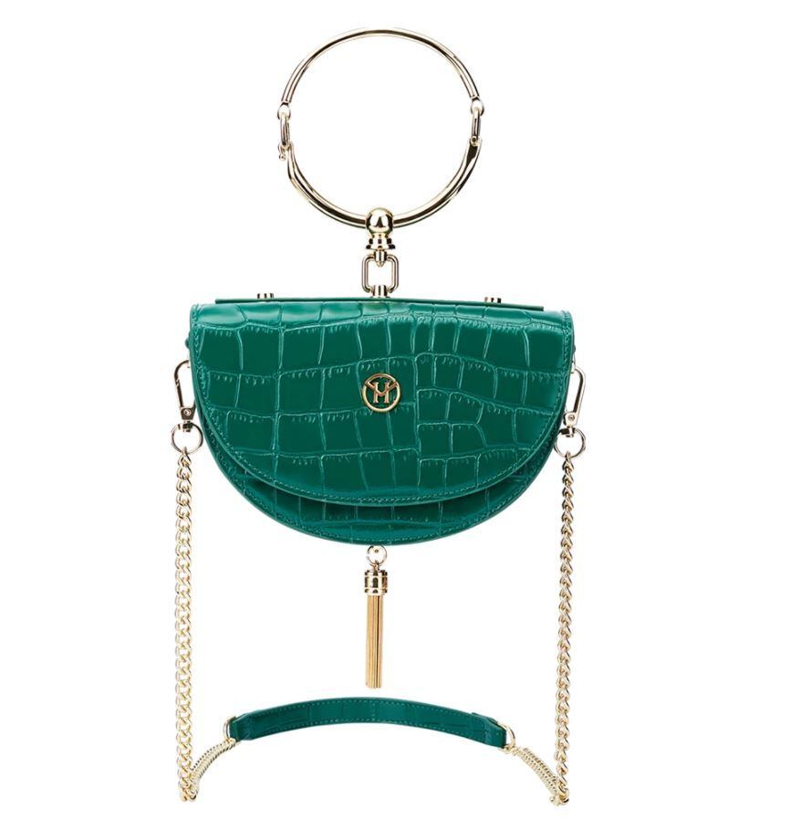 ヴィンテージハーフムーンバッグをグリーンにして、ファッションを表現します。このリサイクルされた革のハンドバッグは、すべてのファッショニスタにとってなくてはならないものです。三日月形のデザインは、精巧な金色のディテールと金色の金属で作られたロゴプレートによって補完されています。バッグは手に持って、またはショルダーまたはクロスボディの上にチェーン要素で作られた取り外し可能なストラップで運ぶことができます。パーティーナイトの必需品はすべてこの小さなハンドバッグに収まり、ポケットのおかげで完全に整理されていて、いつでも持ち運べます。