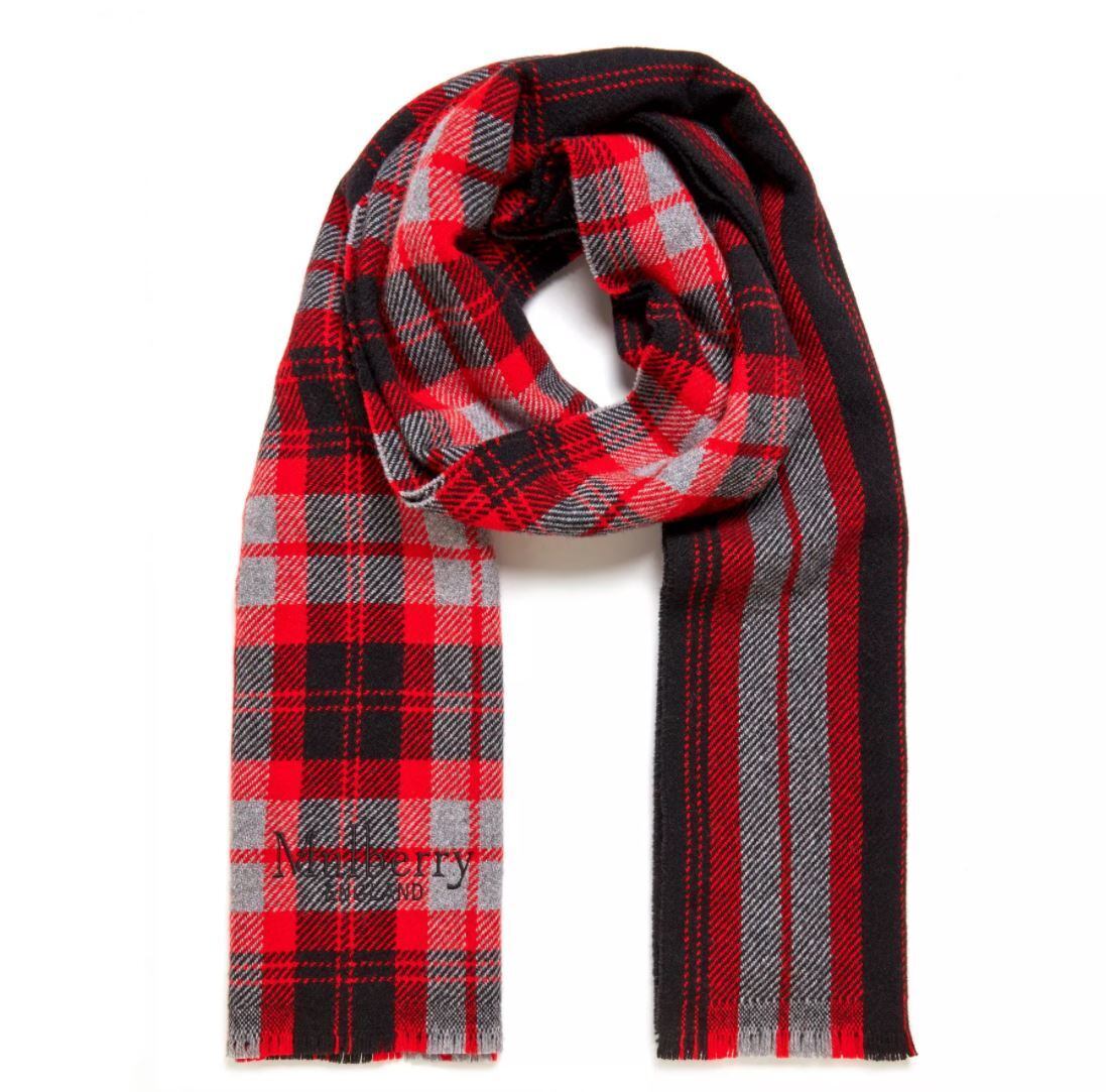 Mulberry(マルベリー)チェック&ストライプスカーフ スカーレット&ダークグレー