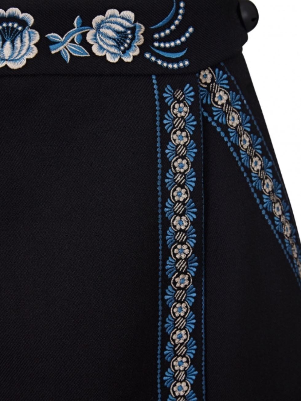 -刺繍が施された水色とクリーム色のディテールが施された、ギャバジンの重い黒のスカート