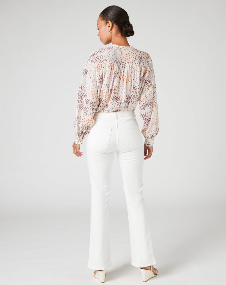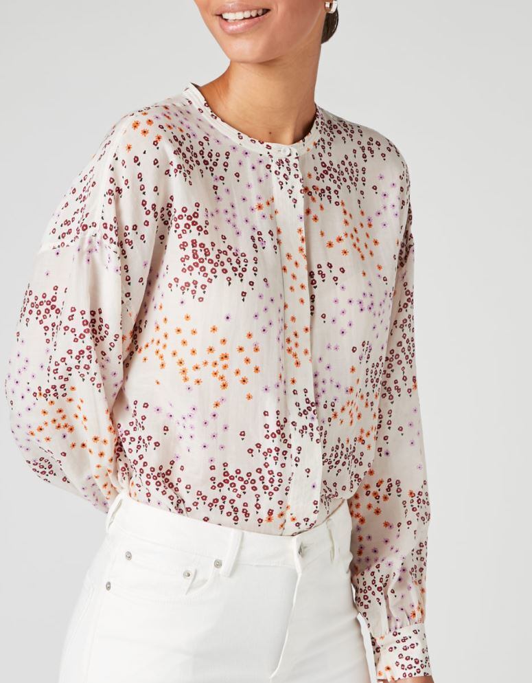 ふんわりエアリーフィットの軽量コットンシルクボイルブラウス。ドロップショルダー、ギャザーバック、袖口が特徴です。マルチステッチの前立てとスタンドカラー。