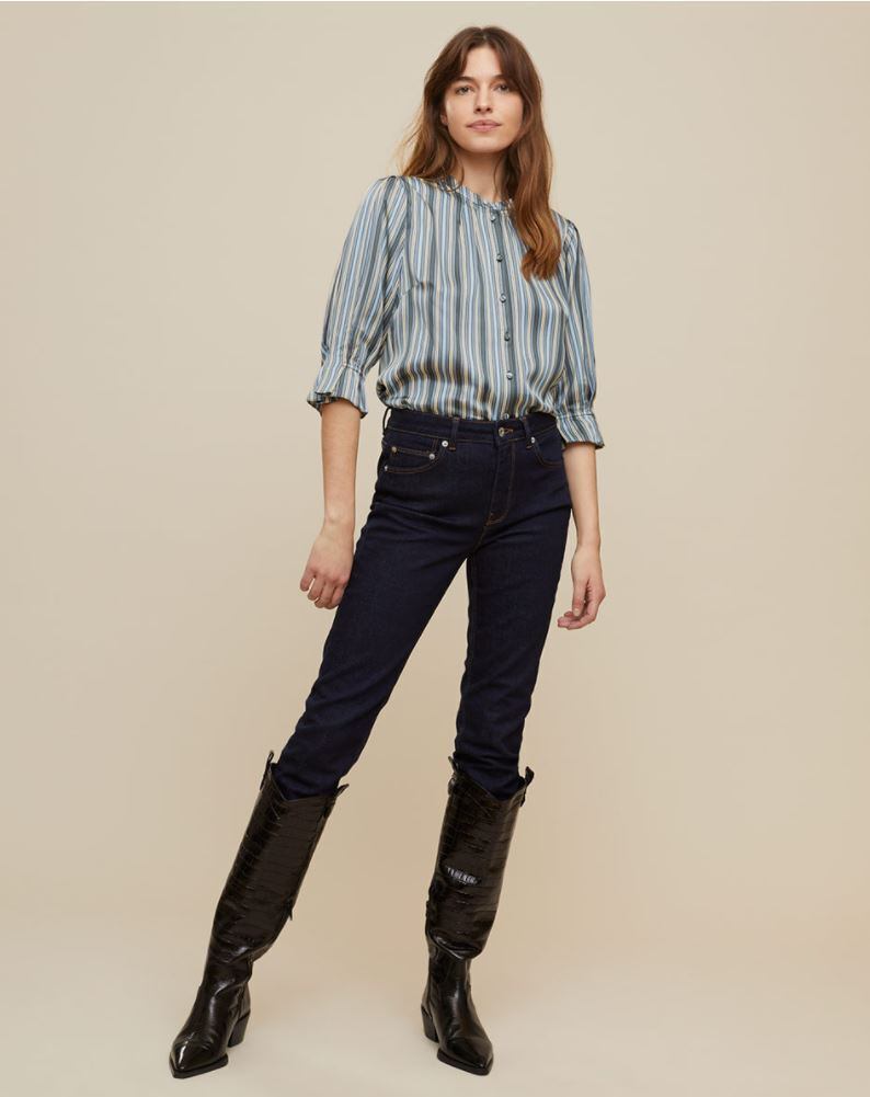 マルチストライプシャツ。長さ3/4のバルーンスリーブ。袖口に伸縮性ギャザー。おじいちゃんの襟。襟の下にステッチの二重層。センターフロントのカバー付きボタン留め。サイドスプリット。