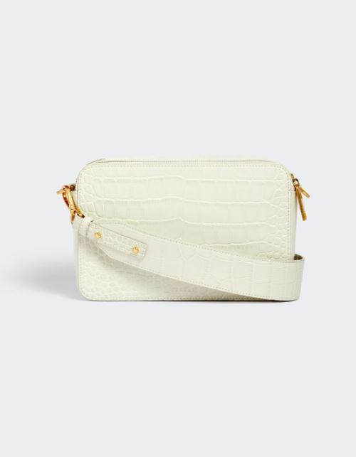 100%レザー。クロコダイル型押しの質感。クロスボディストラップ。ヘリンボーンの裏地。分厚いジップバックル。外ポケットと内ポケット。アイコンのコレクション。